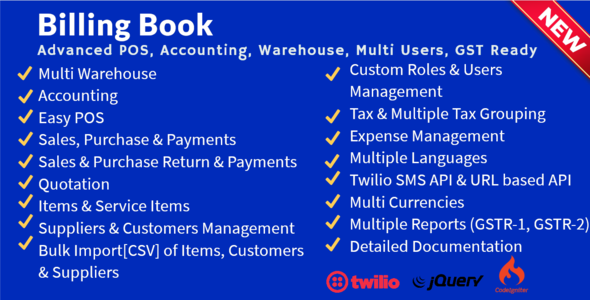Buku Penagihan adalah aplikasi berbasis web PHP/jQuery yang memungkinkan Anda untuk mengelola faktur, pelanggan, pemasok, stok. Aplikasi memiliki sistem POS Mudah untuk sistem penagihan yang lebih cepat. Template web yang sangat responsif telah digunakan, aplikasi berisi kode sumber yang lengkap dan mudah untuk dimodifikasi sesuai kebutuhan Anda. Aplikasi dapat siap untuk diinstal di komputer lokal atau di server online dengan proses instalasi yang mudah.
