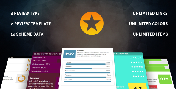 Create reviews! Choose from Stars, Percentages, Circles or Points for review scores. Supports Retina Display Unlimited Color Schemes.