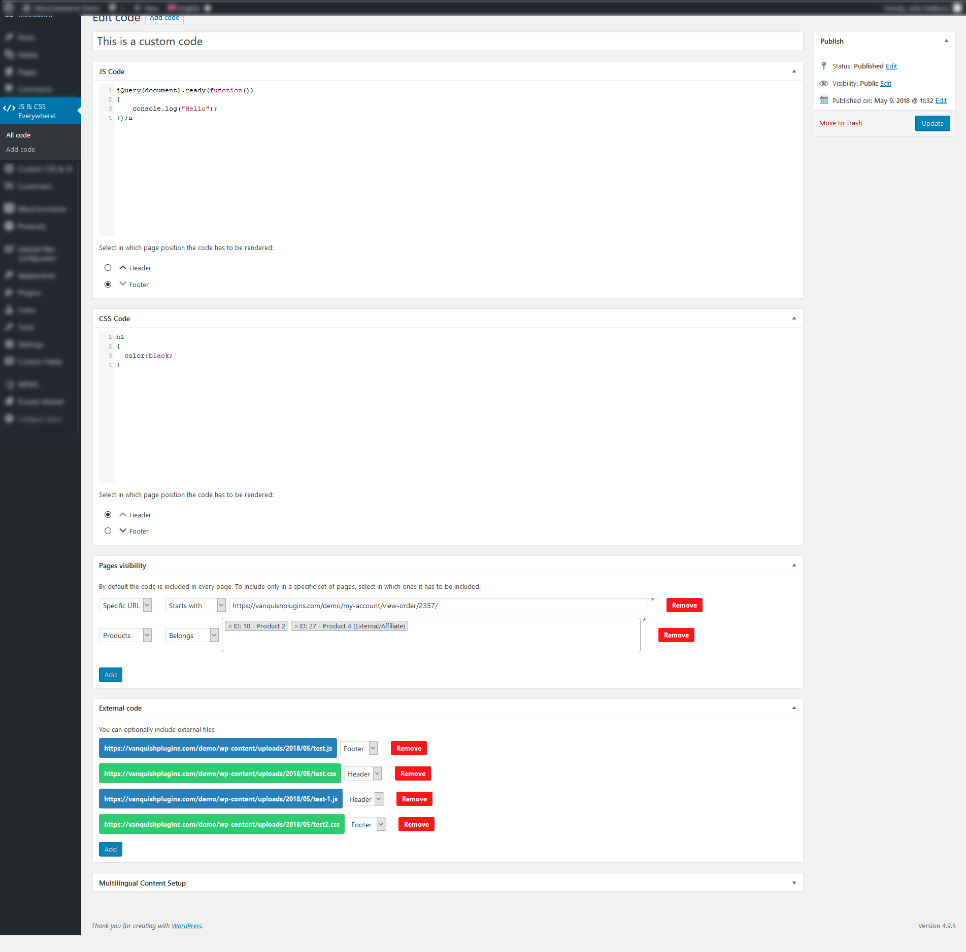 Plugin ini memungkinkan Anda untuk menyematkan kode CSS dan Javascript ke halaman manapun (atau hanya di halaman yang dipilih). Itu bisa dilakukan melalui Kode global fitur atau langsung dengan mengedit halaman / post / custom post yang Anda butuhkan. Fitur utama: