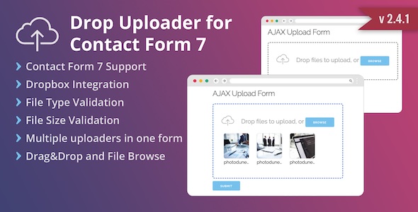 CF7 Drop Uploader WordPress plugin allows you to add powerful Drag & Drop File Uploading area to your Form, that was built with Contact Form 7. You can add several file uploading areas for one form, set maximum files amount for each field, maximum file size and file type for each of them. You can send uploaded files as mail attachments, links to Dropbox or upload them to your server and send links to them. Also, Drop Uploader supports Javascript file validation, so it can handle errors before the file was uploaded.