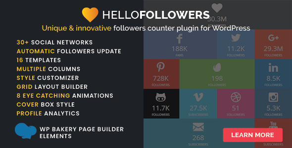 Unique and innovative followers counter plugin for WordPress that automatically displays followers/fans/subscribers from your social networks in attention grabbing way. It was never so easy to attack new followers directly from your site.