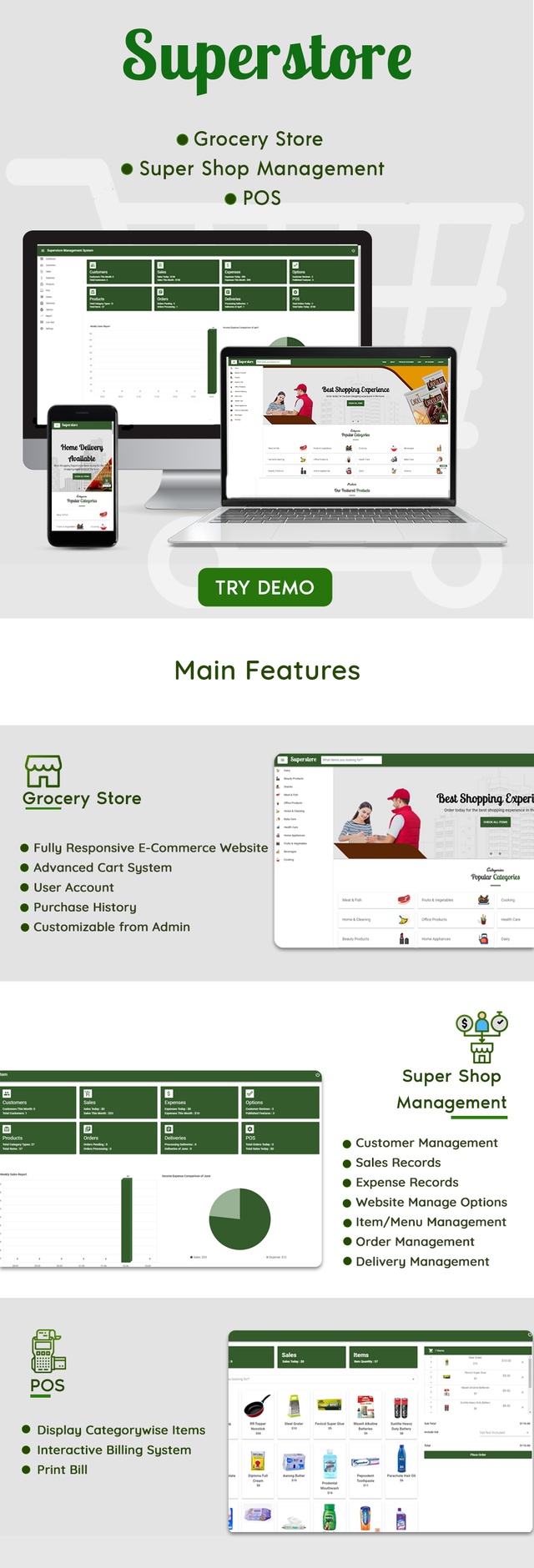Superstore memiliki panel berbeda untuk Admin, Manajer & Pelanggan. Pelanggan dapat memeriksa riwayat pesanan mereka,